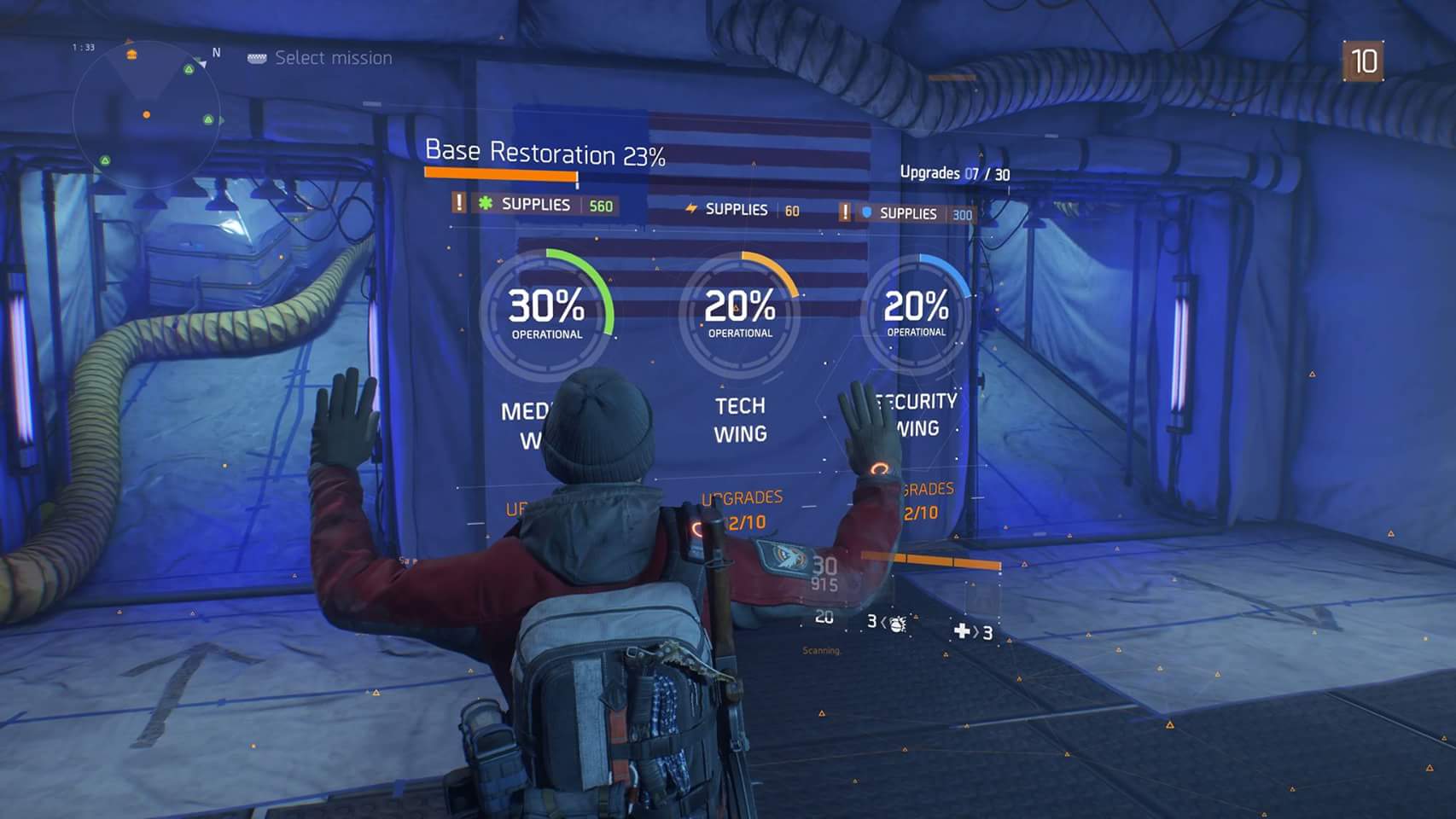 As the base beings to grow, the progress-bars and in-game percentages/fractions begin to creep into the game world as if they were part of the “Dollar Flu” that’s plagued NYC. While I’m not one to generally complain about stat/progress-tracking in games (again, as a completionist, I usually enjoy this stuff), it’s a bit overdone in this instance. Before the player even walks into the main portion of their base, they’re presented with a huge progress-display that’s almost impossible to ignore. Furthermore, as the player explores the individual wings/expansions, progress-menus remain suspended in the air reminding the agent that they’re only 25% towards being completely operational, for example. It’s certainly a way to entice (or take advantage of) players by making them engage in the “just one more game/mission” mentality, but it’s all so overwhelming, nonetheless.