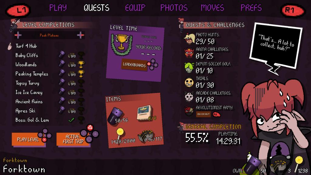 Navigating the environments feels pretty good, but the level design is inconsistent, lacking cohesion and the combat arenas are just not enjoyable. Jumping on top of Goombas or throwing fireballs at them in Mario isn’t very interesting on paper, but at least it always feels good. The forced combat scenarios in Demon Turf ruin the stage flow (especially around a game that emphasizes time trials). The boss battles are really weird, too. They’re disproportionately difficult compared to the rest of the game and while it’s cool that they require you to use your new-found abilities in order to defeat them, they could have been executed better. The checkpoint system has its ups & downs as well. You can essentially plant a checkpoint flag anywhere in a stage, which gives the player the ability to customize the level difficulty, in a sense. I found myself forgetting to plant the flags when I really needed to because some stages were way longer than others and I would simply forget it was an option due to the inconsistency. I finished Demon Turf at around 55.5% of the game completed and while I enjoyed parts of the game, I’m not in any rush to come back to it.