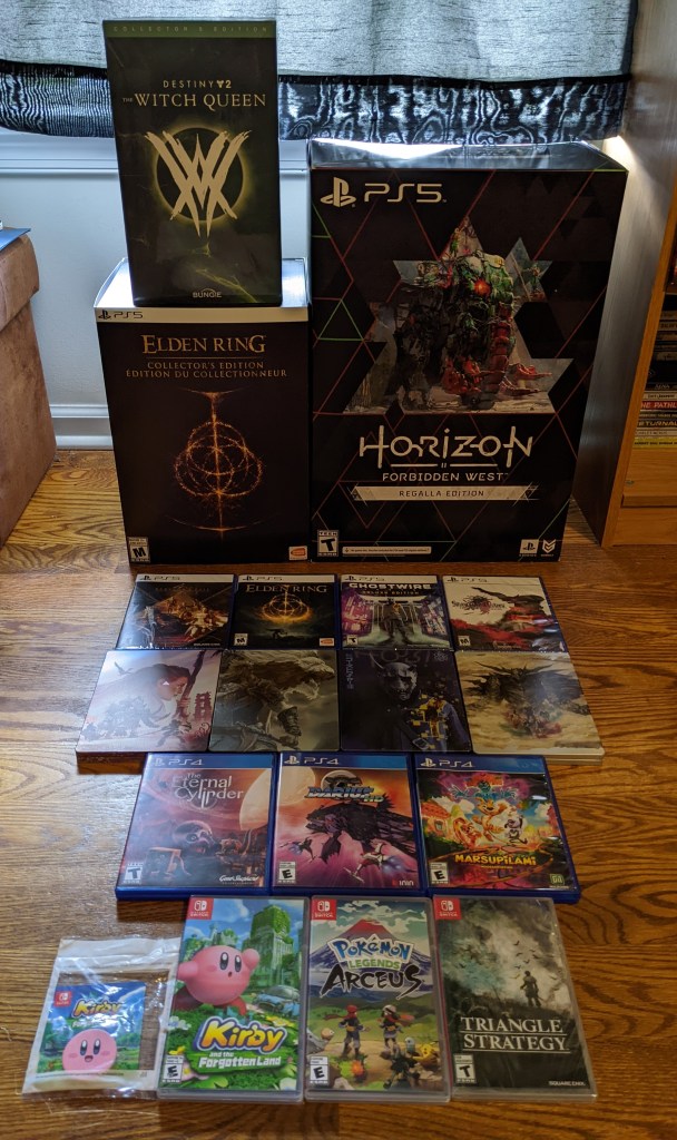 The first quarter of 2022 saw the release of many anticipated “AAA” releases, an endless onslaught of indies and all of the in-between. GhostWire: Tokyo, Elden Ring and Kirby and the Forgotten Land were probably my most-wanted games from Q1 2022, but I couldn’t help myself from picking-up a bunch of other goodies too. Despite having never finished a Pokémon game since Red & Blue, I picked-up Pokémon Legends Arceus against my better judgment. I’m 10-15 hours into Horizon Forbidden West and similar to how I feel about the first game, I’m liking it, but not loving it. Destiny 2: The Witch Queen was probably one of the best expansions Bungie has released in a minute, but I unfortunately had to solo the campaign on my own, which wasn’t very fun at times. The only three games I’ve yet to play/try out from the picture above are Triangle Strategy, Babylon’s Fall and Stranger of Paradise: Final Fantasy Origin. I did not list my digital pick-ups here, but I have downloaded a few. There’s just way too much good stuff to play this year and the hits aren’t slowing down anytime soon.