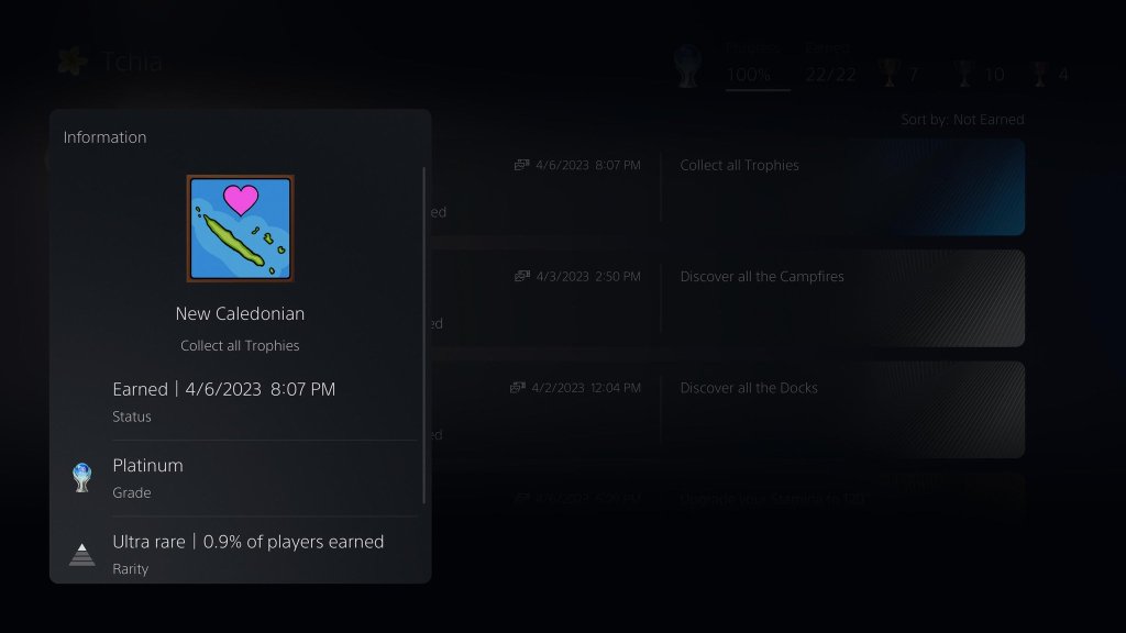 The hardest thing about the game is getting Gold trophies on the Diving Board challenges. The controls and scoring are so particular and frustrating, especially when you make a poor landing and have to climb back up to the starting area. Outside of an optional treasure hunting quest, the game doesn’t ask you to use most of the animal’s abilities. I don’t think there’s a single spot in the game where you’re asked to use night vision, for example. Digging up holes as a dog is exclusively tied to unearthing optional treasure chests that’s part of the aforementioned quest. There are also great accessibility options available including the ability to turn off all of the notifications and pop-up menus while exploring. I approached the game as a Ubisoft-style checklist and left mostly everything on, however. Tchia is collect-a-thon through and through; there are fruits to collect which increase your stamina and treasure chests to find which reward you with cosmetics, among other goodies. If you do play the game with notifications turned off, the game does a good job of highlighting points of interest and collectables visually. When you’re gliding through the air, almost everything that can be interacted with/collected gives off a shining glint from a distance. Even the buoys in the water flash until the treasure chest that’s anchored below them is collected. I really enjoyed my 30 some hours with Tchia and I hope the developers make a sequel or something new again inspired by this part of the world. I completed the game at 100% with the Platinum trophy earned.