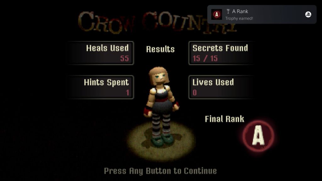 The soundtrack, by Ockeroid, is most-excellent. “Locally Feared Lawsuit Attorney” is one of my favorite tracks of the year; I can’t stress how much this piece taps into those brief moments of respite, which is something the original RE games captured so well. The “save room” music is great, too. Crow Country is an extremely enjoyable, yet light survival-horror experience. It’s not exactly replicating the survival horror games of yesterday, but there’s enough of that DNA here for veterans of the sub-genre to enjoy. More importantly, it’s very approachable for newcomers. I completed the game with an A Rank earned which unlocked a “Crow Bar’ and “Crownade Launcher”. Someone clearly loves old RE games and their unlocks. The ranking requirements aren’t too bad, either. The game ranks you based on heals, hints and lives used, in addition to how many secrets you’ve discovered. Discovering all of the secrets is the hardest thing about the game, honestly. There are many hidden elements tucked away in each area of the park and I somehow discovered them all on my own, which felt really good. I’m tempted to go for the S Rank, but there’s just far too many other games I want to play right now. The developer is planning to update the game with some fixes and even a “Hard” mode (which, at the time of writing this, might already be available), but I’ll revisit it down the road. Maybe everything will be okay…