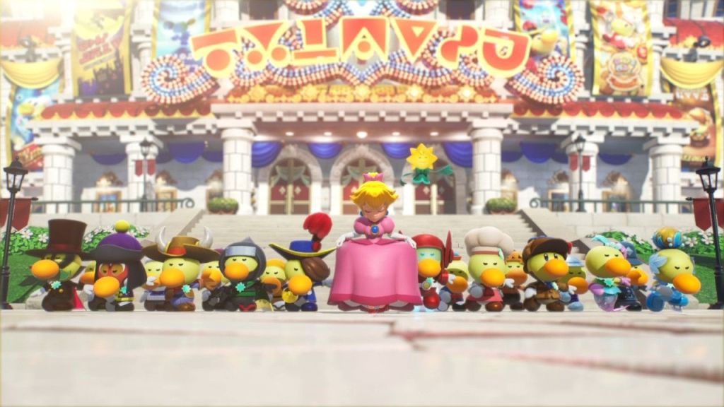 Princess Peach: Showtime!, developed by Nintendo and Good-Feel, is a 3D action-platformer and the first game since the Nintendo DS title, Super Princess Peach, that stars Princess Toadstool. Peach has been known to send a letter or two in the past, but this time, she’s the one receiving the invitation! The game begins with Peach being cordially invited to the Sparkle Theatre to watch a bunch of plays. Shortly after her arrival, everything is thrown into disarray when Madame Grape and her “Sour Bunch” takes over the theater. If you’re wondering if the game takes place in the Mushroom Kingdom, it isn’t specified where the Sparkle Theatre and its denizens of “Theets” is located exactly. The game sort of treats the island where the theater is located like it’s Isle Delfino from Super Mario Sunshine (SMS). During the intro cinematic, you can see a toad carrying her briefcase, as if they flew into the island ala SMS. The main gimmick in Princess Peach: Showtime! is Peach’s ability to don a variety of costumes, which grant her new forms with unique powers. Peach can turn into a cowgirl, a baker, a ninja and even a detective. The cowgirl can whip enemies and ride a horse through set-piece-like sequences while the baker is more or less an elevated Mario Party mini-game where you decorate cakes. I think the ninja costume is most reminiscent of director Etsunobu Ebisu’s legacy, considering it’s his first appearance as a game director since Mystical Ninja Starring Goemon on the Nintendo 64 (N64). The way the jumping feels and the accompanying “whooshing” sound effect Ninja Peach makes reminds me the most of Goemon and friends.
