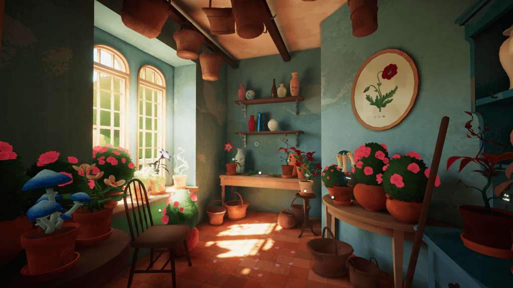 Botany Manor, developed by Balloon Studios, is a first-person adventure game where you grow plants in a Victorian English manor as botanist Arabella Greene. Most of the story is told through notes and letters left around the manor, but there’s an underlining plot about how woman have no place in this profession, considering the period in which the game took place, yet your character wants to prove themselves by becoming a publisher and writing a book. Botany Manor is a very colorful game with its use of soft shading; it’s just very a pleasant and calming to look at. The goal of the game is to grow all of the plants in the manor. Structurally, it feels like you’re in a Resident Evil-style mansion; there’s shortcuts, secret entrances, and gated areas that require keys and such to progress. In order to grow a plant, you’ll first need to find a seed. Once you collect a seed, there are stations located around the mansion which will provide you with empty pots, soil and a watering can. From here, you need to explore the manor and look for clues and information on how to grow the plants. In one instance, you might have to open and close windows in a tower so the right amount of wind flow helps grow a particular plant. In other instances, you actually have to play music or use More Code. The game certainly doesn’t hold your hand, but once you grow your first plant, it’s pretty much the same process for the rest of the game.