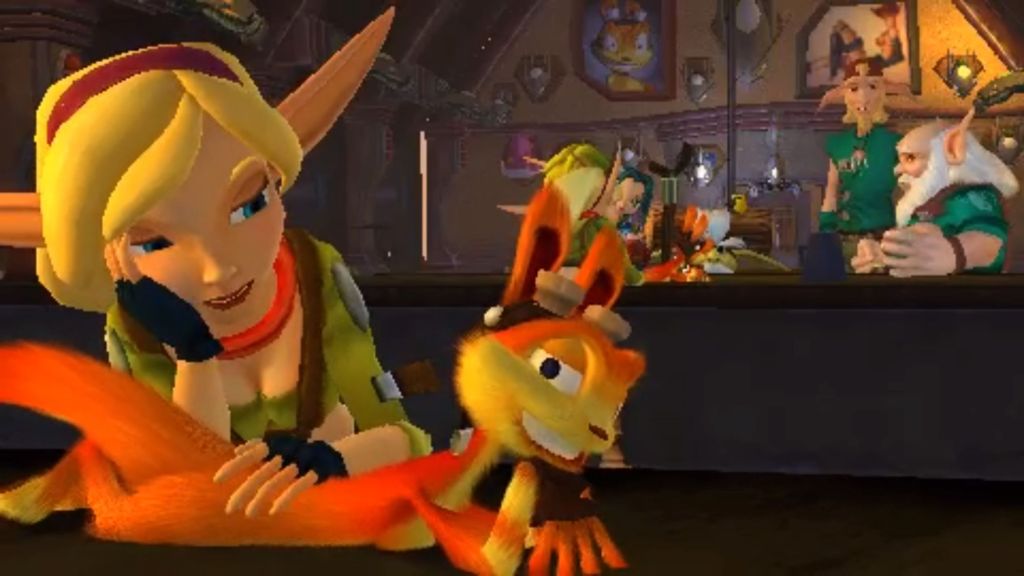 The game takes place right after the first game when Jak & Daxter jump through a portal and arrive in Haven City, a dark and futuristic world powered by Eco (an important resource in the J&D world). Jak is immediately kidnapped and imprisoned while Daxter gets away and becomes a bug exterminator? From there, Daxter performs odd jobs around the city, killing bugs and learning what he can of Jak’s whereabouts. There’s really no connective tissue between Dexter’s new bug squashing job and the disappearance of Jak. The whole conceit of the game feels like a lame excuse to simply let Daxter have his own game. Oh, and I’d be remiss if I didn’t mention the “Gex-ification” of Daxter. While Daxter was known for being a sarcastic, often crude side-kick in the previous games, he’s far more offensive in this game than any of Naughty Dog’s affairs. There’s a new elf-like woman who’s clearly designed to be the “hot girl” for all the prepubescent teens who needed something more edgy back in 2006. Her design is pretty funny too; she’s got that unnecessary g-string sticking out of her jeans for no reason and a fairly busty chest, who Daxter just so happens to nearly face-plant into after diving head first into a pipe during one of the earlier stage sequences.