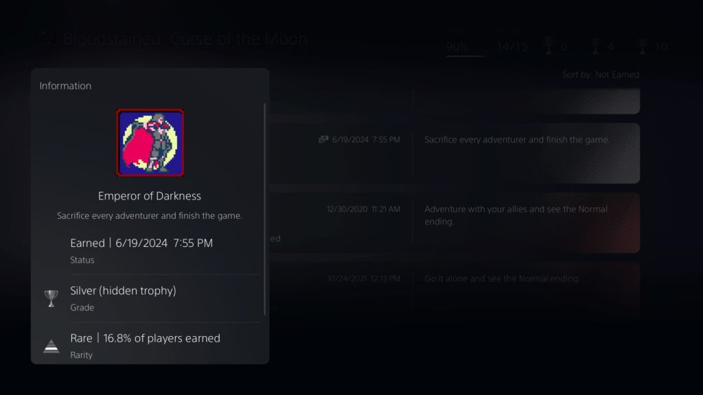 In addition to finishing the game again and seeing an ending I’ve never seen before, I also unlocked and finished the Boss Rush mode for the first time. The Boss Rush mode was fairly challenging, despite the game not being too difficult considering its legacy. The Boss Rush mode gives you all 4 characters right out of the gate and you start in a room where all sub-weapons for each character is up for grabs, along with two health restorative hearts. What’s tricky is that once you grab a sub-weapon, you only have it available for the next fight. So, if you picked one up by accident or it’s not the right sub-weapon for the boss, it’s gone for good until you finish the run or fail. It took me at least 5 or 6 tries to finish the Boss Rush mode after experimenting with particular sub-weapons against certain bosses. I learned new things about how to fight the bosses, so I found the whole mode to be quite rewarding. With that said, I have no reason to ever play this game again since I now have 100% of the trophies earned. Perhaps it’s time to finally play Bloodstained: Curse of the Moon 2 after all these years of neglect.