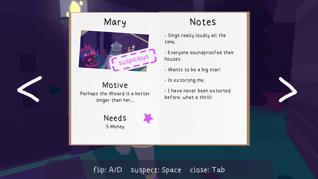 As I mentioned above, at one point, you’re given the opportunity to decorate your case file (notebook) with decals and stickers. It’s actually a really fun moment and I spent more time customizing my notebook than I was expecting to. The best way to describe the writing style in Frog Detective is that it’s purposely dry. The game breaks the fourth wall at times, too. Another mechanic I enjoyed was how the Detective updates his notebook with details like “Motive” or “Needs” based on the people he interviews. You don’t really need to pour over your notes to solve the cases, however. The game sort of plays itself and mostly has you walking back and forth talking to particular NPCs, exchanging items and the sort. Finally, the soundtrack, by Dan Golding, is very jazzy. It feels like I needed to smoke a cigarette and grab an adult beverage after every session with Frog Detective.