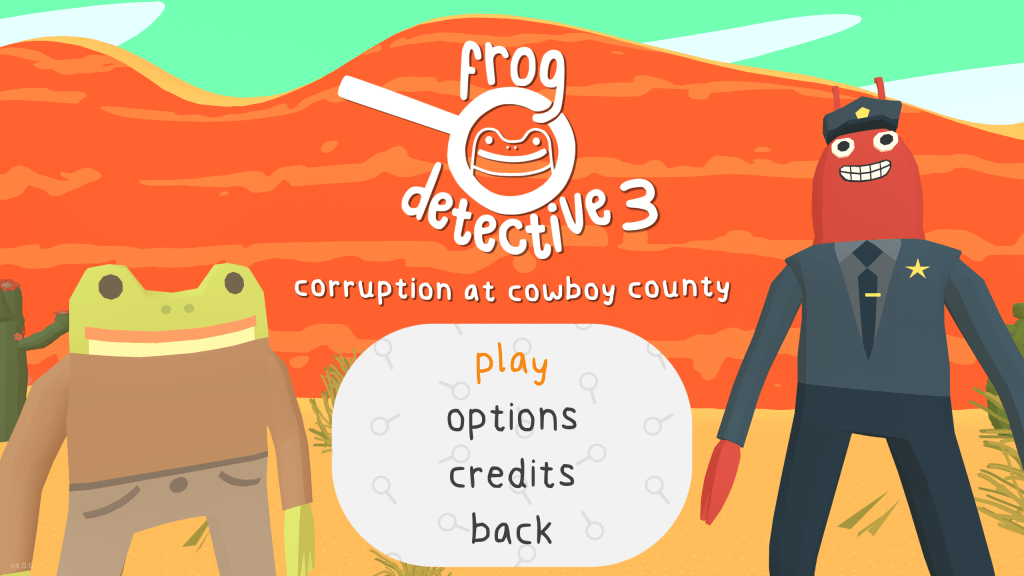 I think Frog Detective 1 “the haunted island” is the least interesting title in the series. You arrive at an island where its inhabitants think they’re hearing ghost noises. The conclusion is ultimately very cute and silly, which can be said about all of the cases. From the second case onward, each case has the Detective arriving at a location where you then interview suspects, noting their motives/needs in a handy notebook (that you can even customize with stickers!), which ultimately leads to narrowing down the suspect. The second case, “the case of the invisible wizard” has you searching for clues to find a new resident who’s moved into a town in a forest. In the third case, “corruption of cowboy county”, an underlining story involving Lobster cop comes to the surface with a shocking finale.