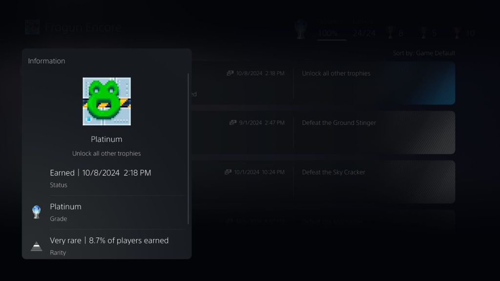 I’ve beaten Jumping Flash! a few times in the past, but for my revisit on PS5, I must have cleared it at least four times across its various modes. Just this year, I discovered there’s an unlockable mode called “Hyper Mode”, which I’m pretty sure I’ve never seen before. While I earned the Platinum trophy this time around, there’s additional modes to unlock/conquer if you wanted to truly complete the game at 100%. To unlock Hyper Mode, you apparently need to score over 3 million points on Extra difficulty, which is the game’s Hard mode. On a casual playthrough, I typically net around 1.5 million, so I’m not exactly sure how I’m supposed to double that score. From what I’ve read, you need to farm enemy kills and complete the bonus rooms for extra points. Something I also learned this year that if you collect the Jetpods in the correct order (spelling “EXIT”), you gain more points at the end of the stage. On Extra difficulty, you have less time to complete the stage, so it sort of requires you to have a complete understanding of enemy/item locations in order to gain the most points. Furthermore, since Robbit can bounce on top of enemies, you apparently earn more points for beating bosses (and stages?) without shooting or taking hits. For unlocking Hyper mode, you also earn an “H” on your file select screen, which I love (and very much want for myself). Maybe I’ll give it an attempt in 2025, but for now, it was fun revisiting one of PS1s most unique launch titles.