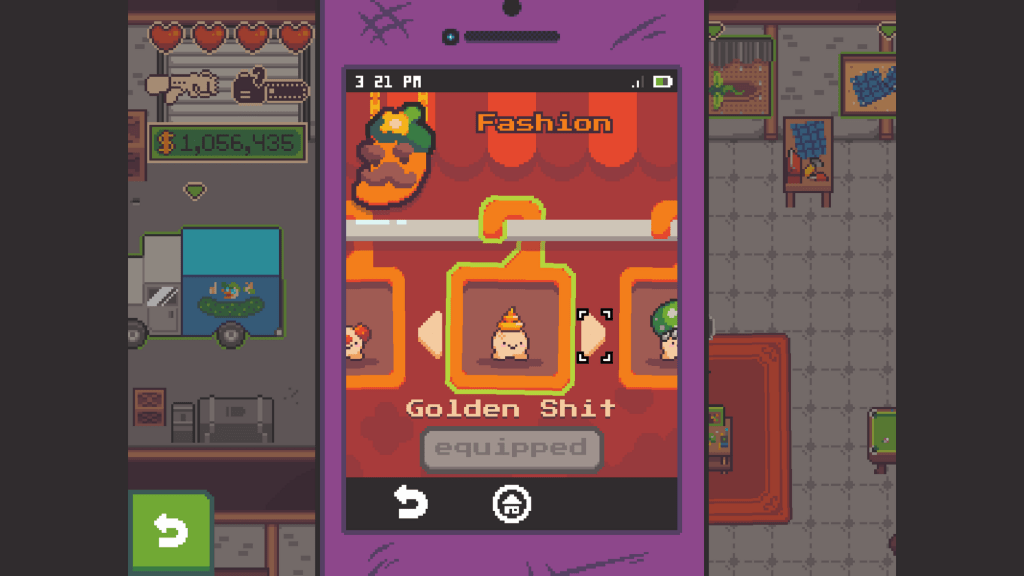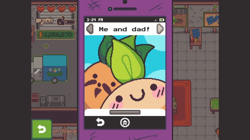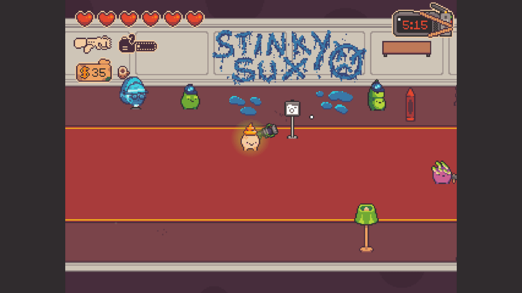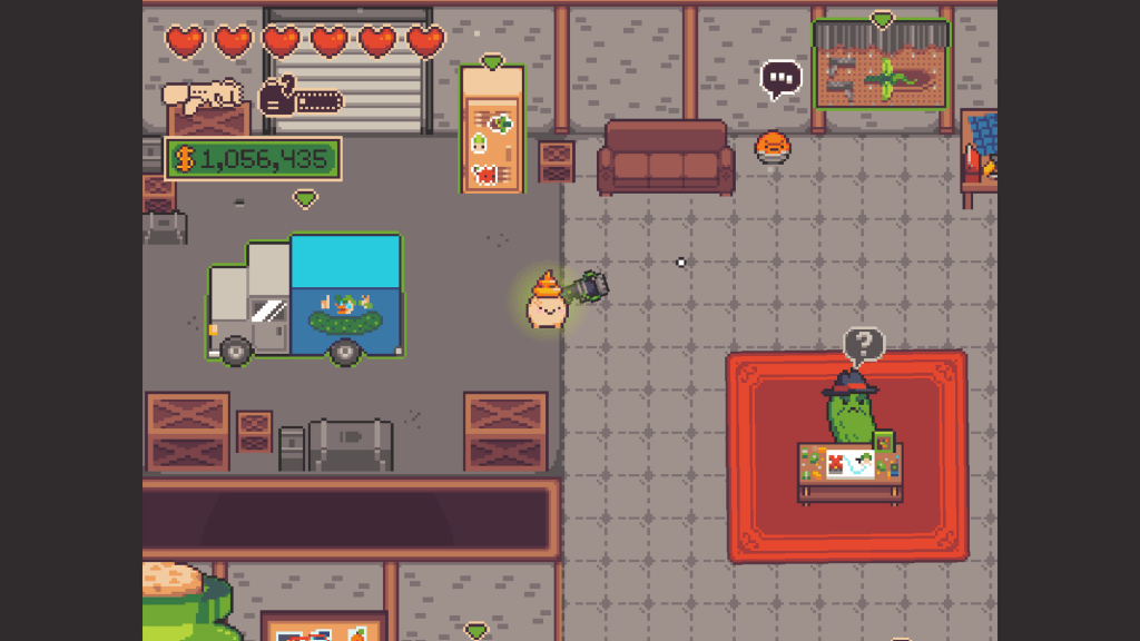 Turnip Boy Robs a Bank has a really addicting gameplay loop. You can purchases upgrades from your base of operations, including special items like a diamond pickaxe or C4 from the “dark web”. These unique items are mostly used to access new areas of the bank in order to progress the story. After you defeat each boss in their respective region of the bank, you unlock shortcuts that allow you to get around more efficiently. Meanwhile, because you can access later parts of the bank earlier, you’ll gain higher-valued items and cash more quickly, which all funnels back into the upgrade system. Some of the upgrades include additional time for your clock (so that you can spend more time in the bank), maximum health upgrades, increased melee/ranged weapon damage, and more. For each weapon you pick-up and escape with, you can either store them for a future run or dismantle them to unlock new weapons that you can bring with you on your next run (think of it like a loadout).