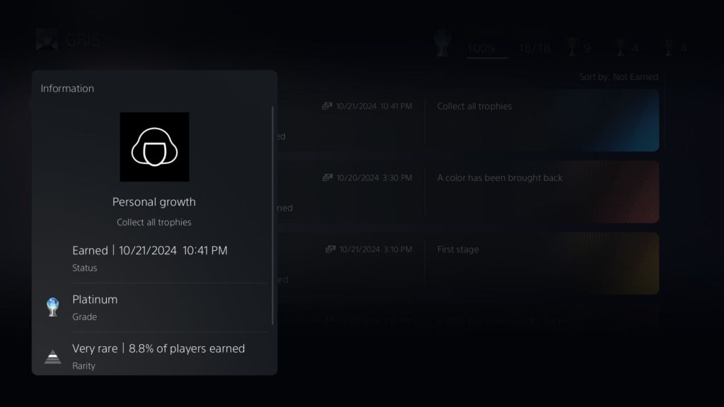 I wish the story resonated with me more than it did. It’s certainly an emotional game about motherhood and a lot of the scenes are really powerful, particularly because of the art and music. With that said, it’s a fairly breezy experience that’s hard to put down due to its exceptional pacing (which is something their more recent game excels at, too). I completed GRIS with everything collected at 100% with the Platinum trophy earned. I did have to look-up a few of the trophies because they’re tied to some pretty obscure interactions. There’s a trophy at the start of the game where you have to walk backwards through the first area and kneel down in front of a broken statue. You have to not move the controller or press any buttons until the trophy pops. I don’t think I would have ever figured that out on my own. There are also hidden glyphs scattered about the stages, which are tied to earning the true ending. After you beat the game, there’s a chapter select which allows you to replay each level in case you missed anything, which is very much appreciated. I like GRIS, but every time I revisit the game, I have trouble connecting with it themes.