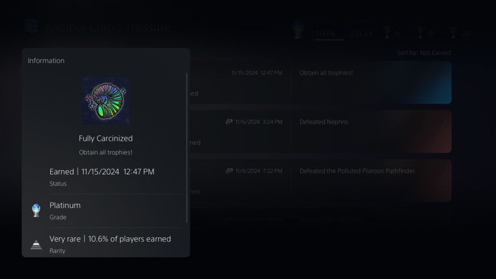 ACT simply commits to the bit and I love it for that. It’s poignant and thoughtful; Kril melts my sometimes very cold heart. I just love the characters so much and the overall message of the game. Kril’s final act of empathy solidified him as one of my new favorite characters of all time. The music, composed by feasley, is also one of my favorite things about the game. There’s something so tragic about the title screen music (which also plays during an impactful sequence near the end of the game). The first major area track is also very memorable. The audible count-in really sets the tone. Expired Grove is simply one of my favorite pieces of the year. With so many 50-100 hour games in 2024, my 30-some hour adventure with Kril and the gang felt like a breath of fresh air. I completed Another Crab’s Treasure with everything collected, all skills learned and the Platinum trophy earned. The developers have more plans for updates (presumably in 2025), so I can’t wait to dive back in. I thought I was tired of Souls-likes, but all I need was Kril and his friends in the end.