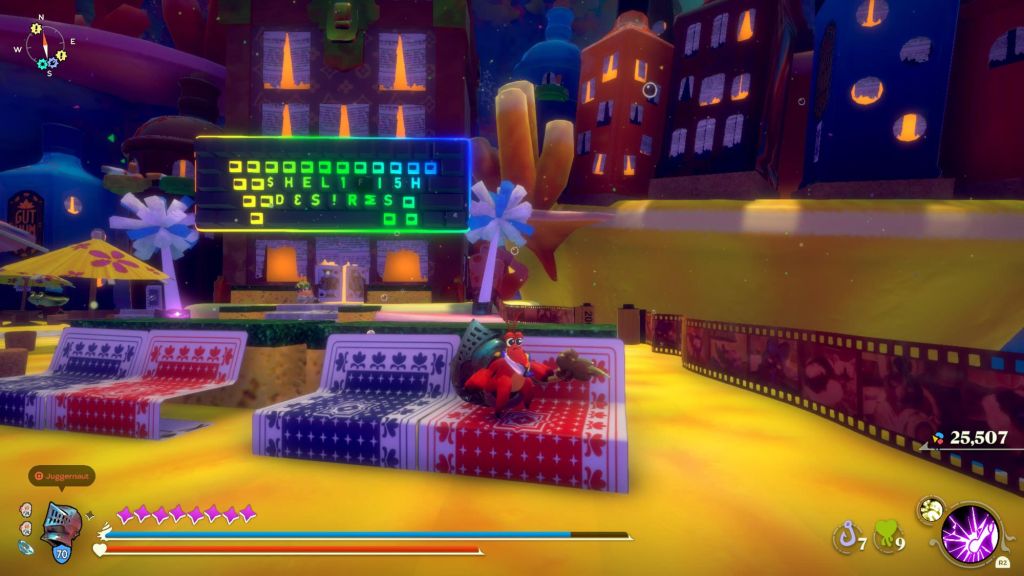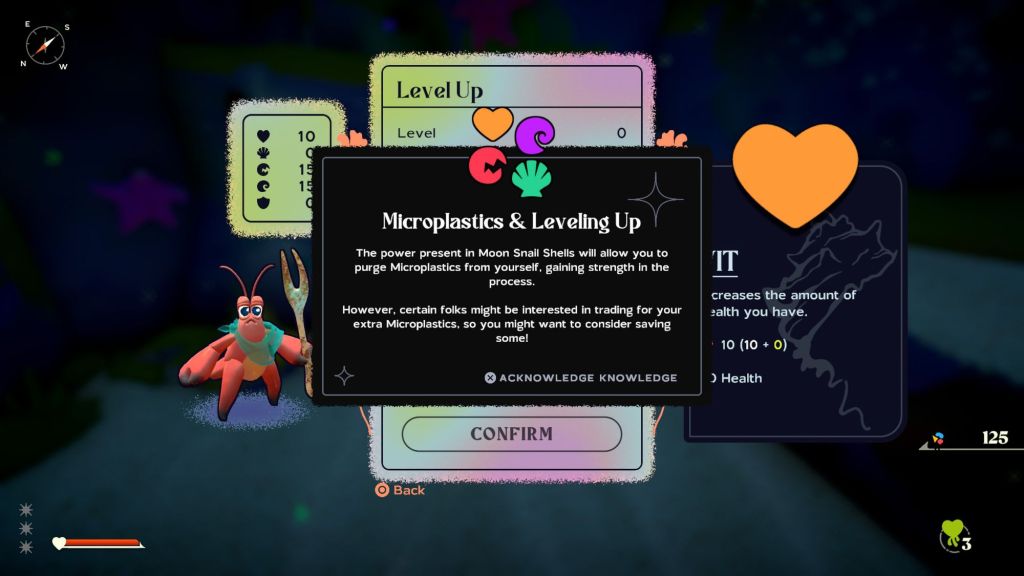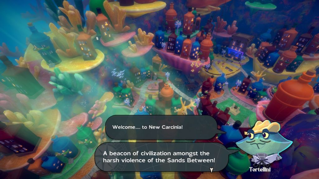 In Another Crab’s Treasure, trash is ironically a commodity. Microplastics are everywhere and everyone wants them (even if its causing them all to go mad). The microplastics are used to purchase a variety of goods, including upgrades to your stats. When enemies are defeated, they burst into colorful confetti (microplastics), which are essentially your “souls”. Like other games in the post-Souls sub-genre, once you are defeated, you need to perform a “runback” to the spot where you died in order to recover your trash. Like any good Souls-like, there are shortcuts and wrap-arounds to unlock that make getting around much more pleasant. The level design in general is tight and well-paced. You’re almost always running into a sub-boss or a fun platforming sequence as you make your way to the main objective in each area. The enemy variety is decent too, although you do fight your fair share of crabs throughout. The visuals remind me of a PS2 era licensed SpongeBob 3D platformer, but much better and more stylized, of course. The game is very colorful and vibrant. The voice acting is great and while every line isn’t voiced, they use Banjo-Kazooie-like gibberish for most dialogue, which is both smart and fitting considering their budget, I presume.