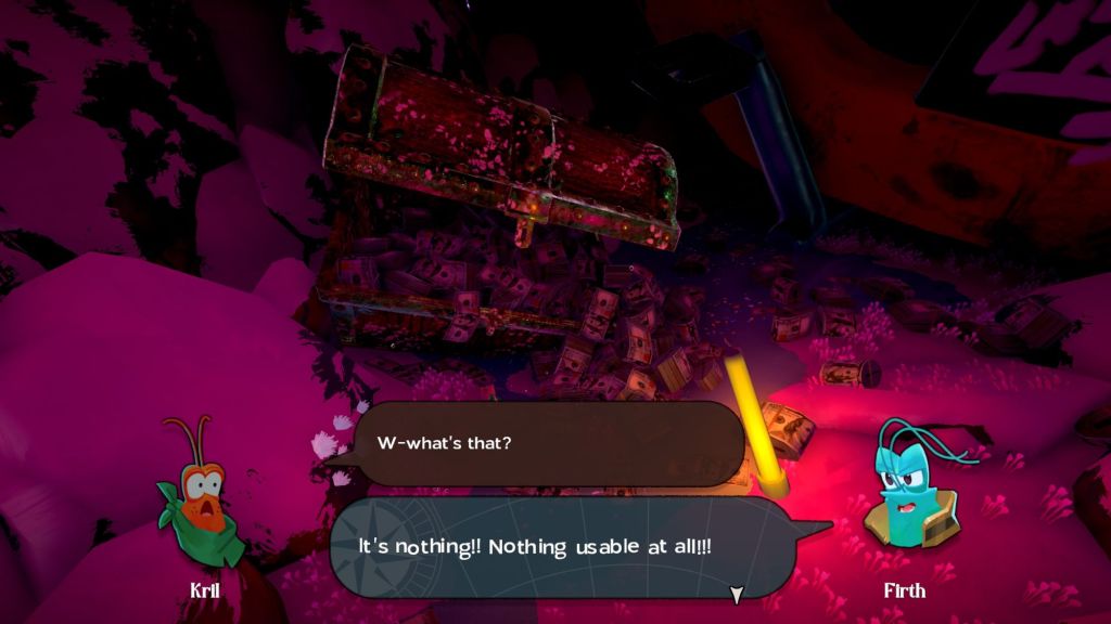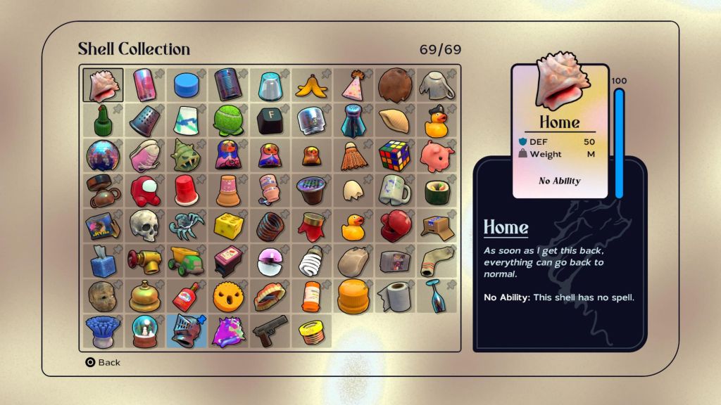 The main gimmick/hook in ACT is its shell system. Since Kril lost his home, he can pick-up various shells scattered about the ocean floor as temporary protection. Sometimes, it’s something practical like a soda can, but you’ll also gain access to party cups, tennis balls, banana peels, tissue boxes and more. Each shell has defensive properties and weight. The defense stat dictates how much damage your shell can take before it breaks. The weight impacts your movement/dodging capabilities. Think of larger shells, like the valve, as a heavy build from a Souls game. In addition to providing protection, each shell comes with a unique ability. The soda can has an ability called “Fizzle”, which emits bubbles that home in on the enemy to deal damage from afar. The tissue box comes with an ability to cure status ailments, for example. There are a lot of abilities, but there’s also a lot of crossover between the shells. Many shells share the same abilities, so the only difference then is the aesthetics, weight and defensive properties. You can also find “Stowaways”, which are barnacles (accessories) that more or less attach to your shell and provide passive upgrades to your character’s stats. I just love how much thought went into marrying gameplay ideas to aspects of ocean life.