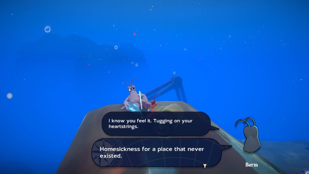 Although ACT is a Souls-like with some character-action game elements, it feels like a 3D platformer at its core. There’s a lot of platforming in ACT and while some of it is automated (particularly with the Fishing Line), a lot of it isn’t. Kril can float/hover for a short period of time by flapping his little claws after he jumps. Little bubbles are left in his trail as he flies through the water, which is a nice little detail. Speaking of small details, Heartkelp Pods are your restorative items and if you idle for long enough, Kril will start juggling one of the pods. Once you start moving, Kril fumbles and drops the pod on the ground making you physically pick the item back up. It’s totally unnecessary, but the unique animation is super cute and funny. Kril also obtains a Fishing Line that acts as a grappling-hook, which allows him to reach previously inaccessible areas (and can also be used in combat). Making a game take place entirely underwater is no small effort. Most games have “underwater” levels, but ACT takes place entirely in the ocean. There’s a moment or two where you surface inside underwater caves and you lose the ability to float in the air. During these sequences, being “out of water” makes you feel more vulnerable, which would be the case for any ocean critter. I wish the game played more with this concept, but like a lot of ideas in ACT, it doesn’t overstay its welcome.