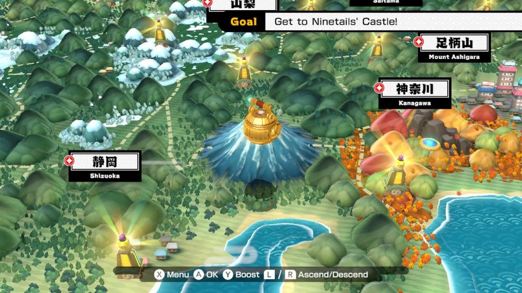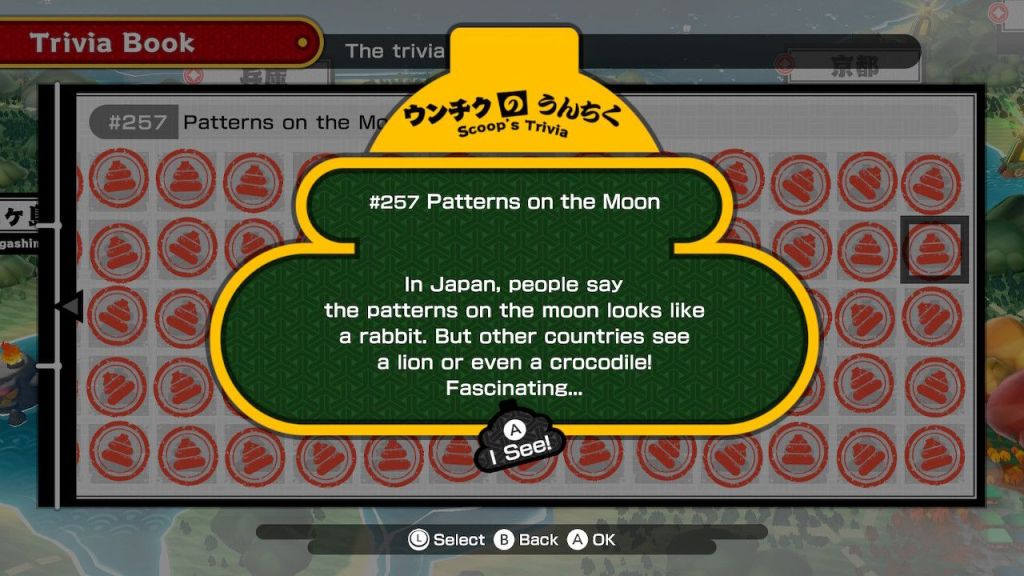 What’s weird about the stage design is that there is so much detail and a ton of background assets that you simply can’t reach or interact with. The Nintendo Switch has seen better days. Bakeru doesn’t exactly run the best on the now-dated hardware. When there’s a lot going on, there’s definitely a degree of slowdown. The size of the levels can’t be helping its performance issues either, so I wonder why they made the levels so big to begin with. With that said, the game has such a nice, clean, colorful look to it. It’s well-animated with expressive characters and fun cinematics. There’s no English voiceovers, but the localization seems decent. What’s interesting about Bakeru as that it’s also sort of an educational game. For one, the game has you exploring all 47 prefectures of Japan. In every level, there are literal pieces of poop to collect, which unlock general facts called Scoop Trivia, most of which are about Japan, its history and geography. Bakeru also has a lot of composers who contributed music to the game, including Satoshi Okubo, Kosuke Inoue, Shinji Yoshikawa, and Eri Tanaka, just to name a few. I’m not super familiar with their work, but a lot of the tracks are evocative of the types of pieces you’d hear in the Mystical Ninja/Goemon games. Wakayama is pretty chill, too.