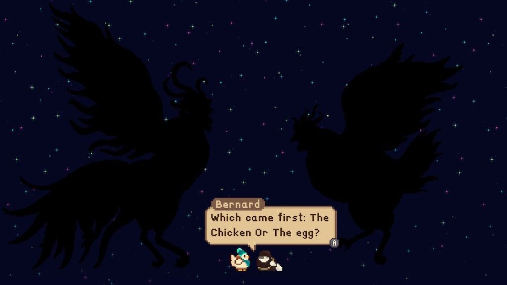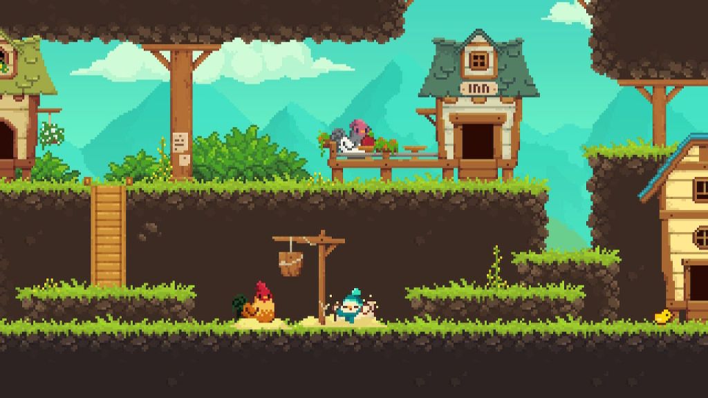 Chicken Journey, developed by Loonyware, is a 2D puzzle-platform that poses the question, “Which came first: the chicken or the egg?”. Chicken Journey is a simple adventure game with some light puzzle-platforming elements. You can walk, jump, peck, interact with NPCs, use items to solve quests and even glide with a leaf. The platforming isn’t very complicated and while you have no health, there’s no real fail state and checkpoints/autosaves are plentiful. While the game is very colorful and the pixel art is fine, the soundtrack doesn’t leave a lasting impression. Chicken Journey is an interconnected, almost Metroid-like adventure where you’ll traverse forests, swamps, ruins, caves and more. Each major area contains a town, a primary dungeon of sorts, consisting of various puzzles and platforming challenges, and a fast-travel point that you eventually unlock so that you can get around faster.
