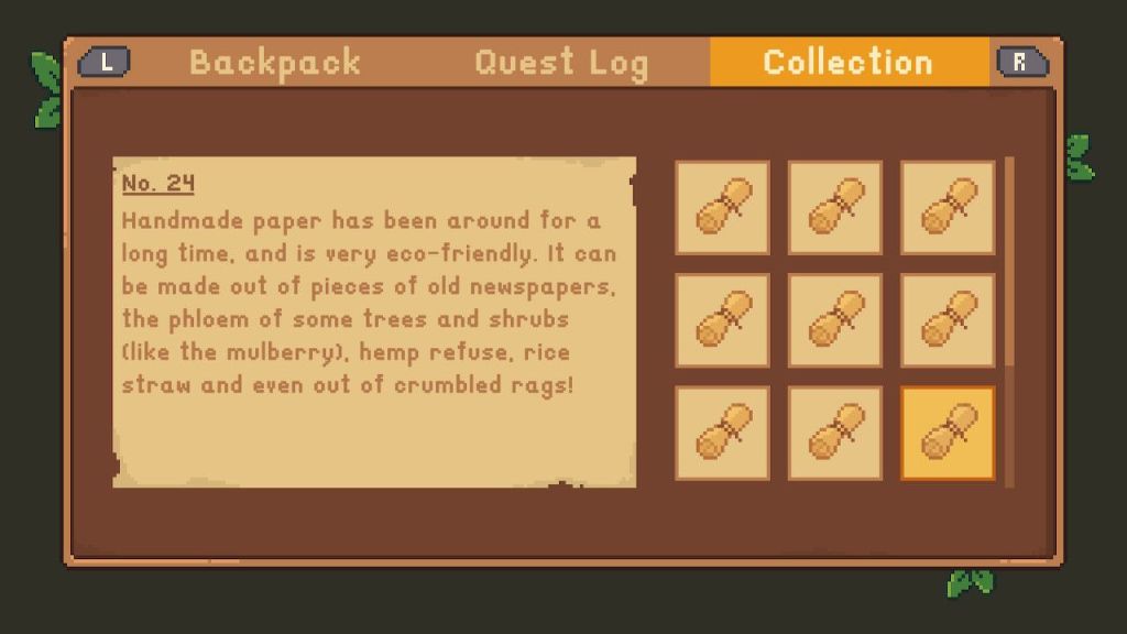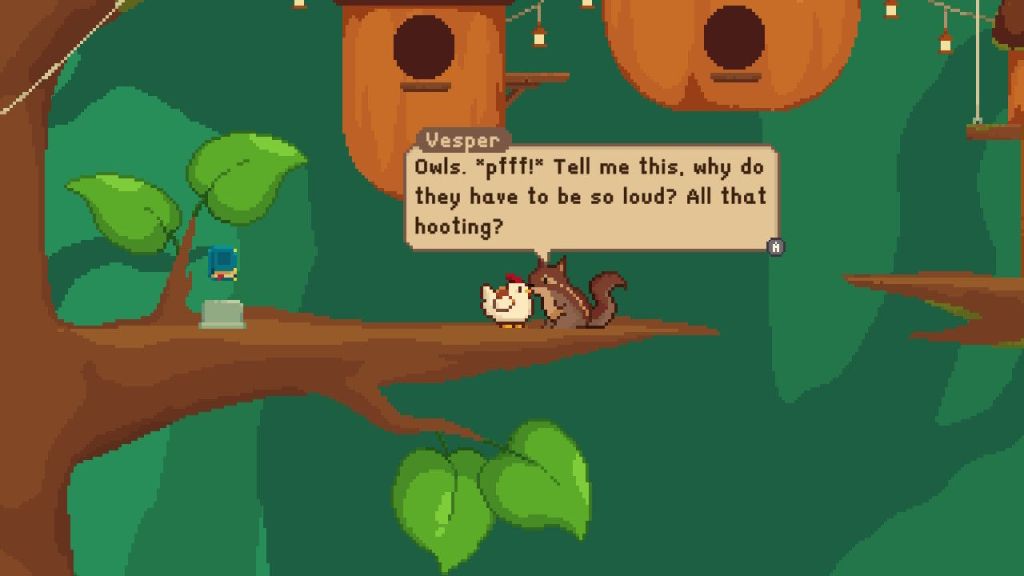 The various towns you encounter are inhabited by animal friends, too. In a late-game quest, you’ll arrive at a village suspended in trees where owls and squirrels cohabitate. The squirrels are mad at all the noise the Owls have been making, especially at night. You’ll eventually discover a sound-dampening item that completes the quest, but I can’t recall if I simply had to talk to a few NPCs or complete a puzzle-platforming challenge to obtain it. The majority of the game has you fetching items from characters or completing dungeon-like spaces in order to solve most of the story quests, however. In each area, there are also hidden scrolls to collect, some of which are relatively tricky to discover (many of them are hidden by illusionary walls, but the scroll’s sparkle usually gives away their location). Similar to Bakeru, some of the scrolls contain real-world trivia or other factoids about chickens and the like.