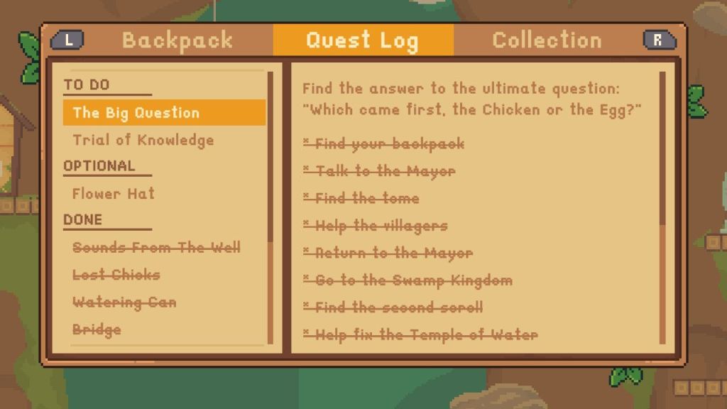I completed Chicken Journey at 100% with all scrolls collected. I am not sure what counts towards the game’s completion percentage, but I think it’s a combination of main story progress, side quests completed, and scrolls collected. Chicken Journey doesn’t do anything particularly new and while I’ll likely never revisit it down the road, it’s a super chill adventure game that doesn’t overstay its welcome. The ending is pretty funny, too.