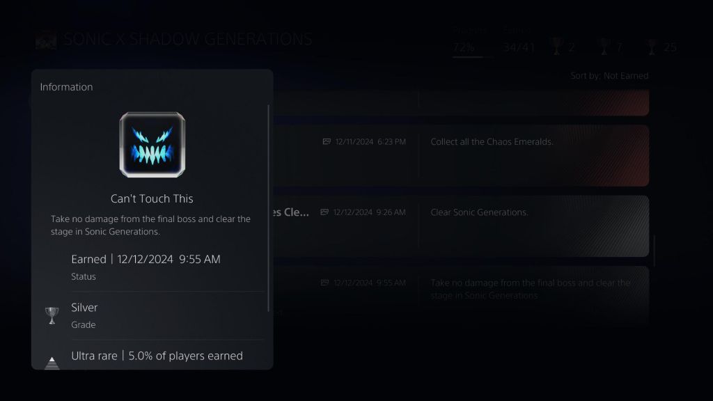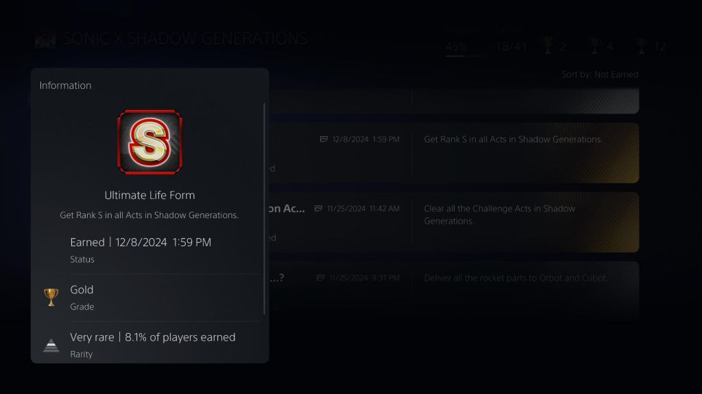 This time around, I only rolled the initial credits on the Sonic Generations portion of the game. While I do enjoying collecting all of the red rings and going for S-Ranks, I’ve already done it all in the original version. I’m also not too hot on hunting down the new hidden Chao. The game may provide in-game hints for the Chao, but they’re some of the worst collectables to ever grace a 3D Sonic game. The last thing I want to do while playing a modern 3D Sonic title is to stop on a dime and look for miniature stuffed animals hanging out on a ledge in the corner of the screen. I completed Shadow Generations at 100% with all collectables. I still have two or three S-Ranks to earn on some of the late-game stage variations in Shadow Generations, but I did earn both no-damage trophies in both games (which wasn’t fun!) I will echo the sentiment that Shadow Generations could have been its own game and doesn’t particularly need the original release to do the heavy lifting, so to speak. I hope Sonic Team learned a lesson here and we’ll see the changes made in Shadow Generations carried forward to the next mainline release.