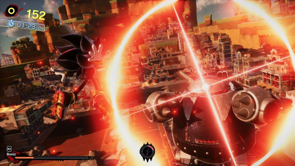 It’s shocking how similar Shadow Generations feels to Bowser’s Fury. The white room is basically a big lake that evolves and expands as you progress through the campaign. The lake can even be traversed once you obtain a particular ability, which reminded me of jumping on Plessie from Bowser’s Fury. One of the big additions to Shadow Generations are the “Doom” abilities; new techniques Shadow learns over the course of the campaign that can be used both in the stages and in the hub area. “Doom Surf”, for example, allows Shadow to seamlessly cross surfaces of water. The “Doom Spears” are used to target switches and enemies with protective barriers. In the hub area, there are tons of treasure chests to discover which require the main collectables found in the stages. There’s also challenges which make use of all of your Doom abilities, but they’re more or less time trials based around obstacle courses. The stage design in Shadow Generations is 3D Sonic at its best. Each level has the numerous routes and shortcuts you’d come to expect, but the dynamic camera angles and perspective changes truly elevate the experience. There’s some really nice visual effects at play here too where the stages twist, turn and collapse on itself in real-time. It almost feels like you’re playing something made by Platinum Games.
