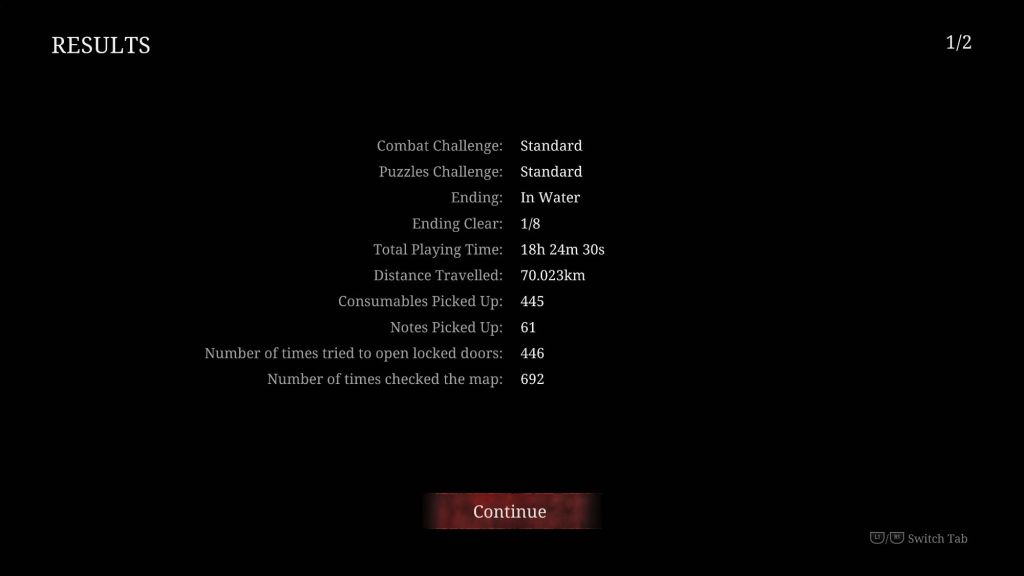 I completed the SH2 remake on Standard mode for both Combat and Puzzles with the “In Water” ending. The SH2 remake contains all of the original endings plus new ones. While there are some trophies that require you to complete the game under certain conditions (like beating it under a certain time limit, without using your radio, or even firing your long-range weapons), the ranking system is strangely absent (even though the game still contains a results screen after you finish it where stats of various categories are tracked). The older SH games always had a ranking system based on stars. Getting a 10 Star Rank in a SH game is nothing to scoff at, either (I’ve never done it before). I will echo the sentiment that there’s perhaps a bit too many enemies at times, but overall, the SH2 remake by Bloober Team is certainly not a disappointment and can arguably stand alongside the original release as a modern-day survival horror classic.