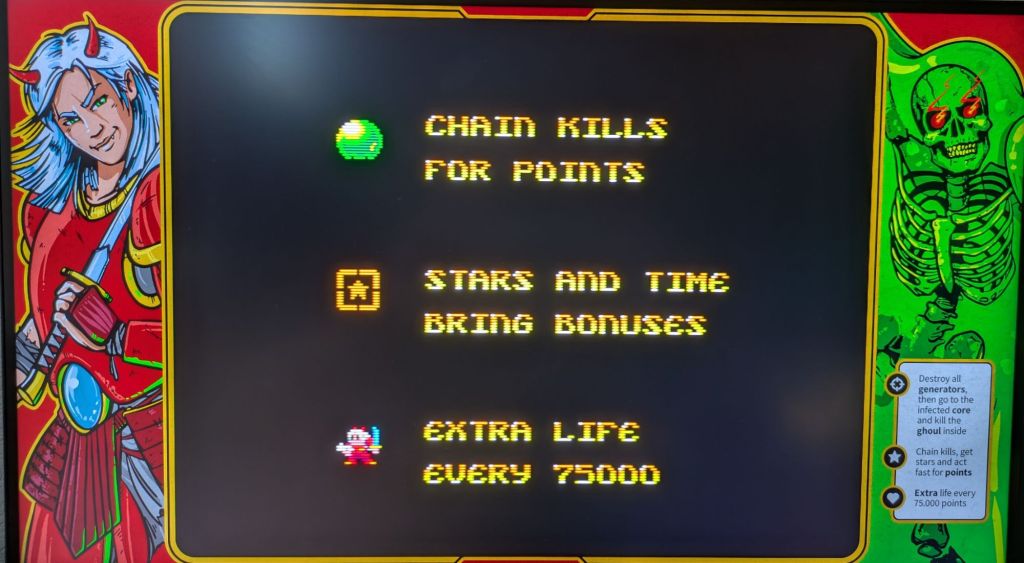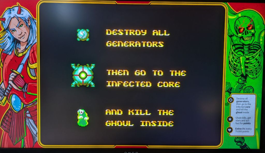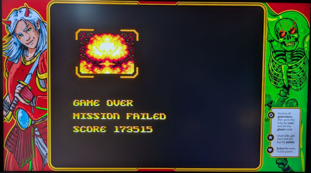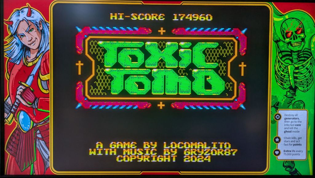 Toxic Tomb, developed by Locomalito, is a 2D, modern-day, retro-inspired arcade shooter where you control a tiny exterminator through a series or 10 levels. Each level introduces at least one new enemy type, which culminate in unique boss encounters. A level is single-screen and if you reach the edge of the screen, it will loop the player back to the other side. It’s very similar to how old arcade games like Fantasy Zone worked. The goal of each stage is to destroy all of the Generators before attacking the Infected Core. After you “destroy the core”, the Ghoul (boss) is revealed. You can chain kills together, but the window to do so is very short. Collecting stars and finishing a stage quickly can net you bonus points. At every 75,000 points, you gain an extra life. Unlikely other vertical/horizontal arcade shooters, there’s no options to adjust the points thresholds needed for an extra life/credit, so it’s a relatively challenging experience.