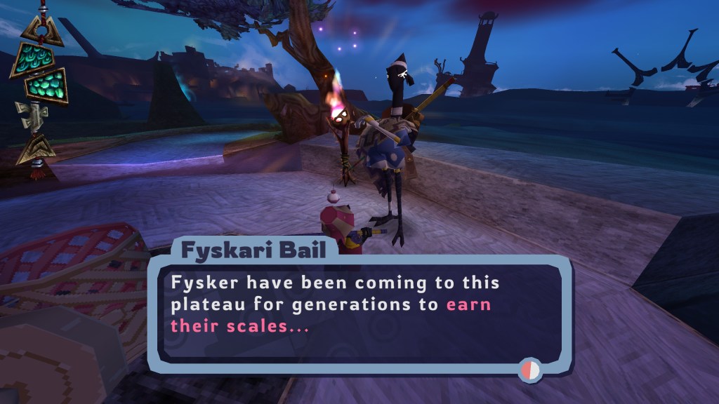 After you complete the tutorial area, Caster will find themselves in the presence of a mentor named Fyskari Bail. They ask you to explore the plateau in search of fish and with each catch, they will trade you coins. The goal of the demo is to earn your “Scales”; a right of passage, so to speak, for the Fysker, which are presumably a tribe of fisherman. In a nearby cave, not far from the starting area, there’s a sealed door that shows a requirement of 696 coins to enter. This is the goal of the Tacklebox demo. Coins can be found scattered in the environment as collectables, many of which are hidden in hard-to-reach places. A good majority of the coins come from the fish you catch and trade with Bail, of which there are 26 to find. When you catch a fish, you’re supposed to bring it back to Bail and toss it into a basket nearby. This exchange feels super satisfying. Caster automatically pulls out their haul once you approach the basket and when you dunk the fish into the container, a handful of coins will burst-out and bounce around the area until they’re gathered. My one critique here is that there are multi-colored fish to collect in the demo. When Caster brings them to the basket and they pop-out above you, they’re always blue. I hope that the full release will take into consideration exactly what types of fish you collected when presenting them. The HUD is also super classy and clean. Your health bar (which looks like the bones of a fish), the fish counter, and the coins you’ve collected sort of dangle from the top of the screen, as if they were hanging from a fishing line.