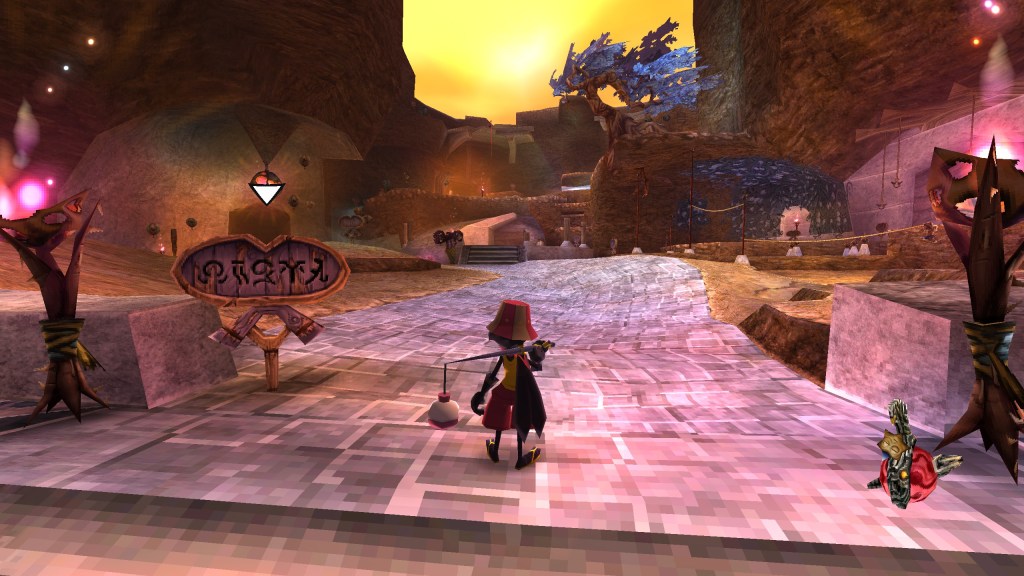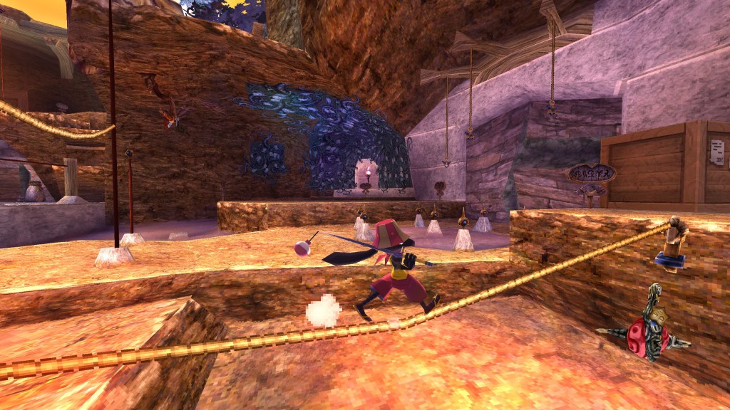After a short opening cinematic where the main character is shown wandering a desert, the game casts you into a tutorial area where you can dip your toes into the controls, reel in a fish, and collect some coins before proceeding to the “open-world”. If you’ve played a lot of 3D platformers in the past, you should immediately notice that The Big Catch isn’t your typical mascot-driven affair. Caster can run, jump, swing their rod to attack enemies, reel in fish, and even swim, but there’s a much more advanced move-set here that’s not totally transparent to the player right out of the (fish) bowl. The tutorial signs don’t teach you everything either, which could be a detriment to some players, as you’re required to learn and master the more advanced techniques in order to complete the demo. In addition to the traditional 3D platformer move-set, Caster can climb-up and balance themselves at the top of poles (Sly Cooper style), walk and bounce on tightropes, swing on poles, (Jak and Daxter style), and even wall-run (Prince of Persia style). On particular walls and ceilings, there’s even moss/vine-like textures that Caster can use to climb and it feels and looks like it’s right out of Rayman 2: The Great Escape!