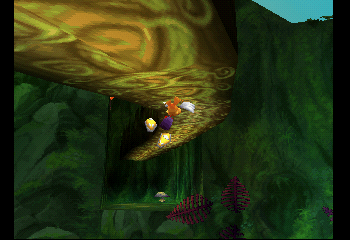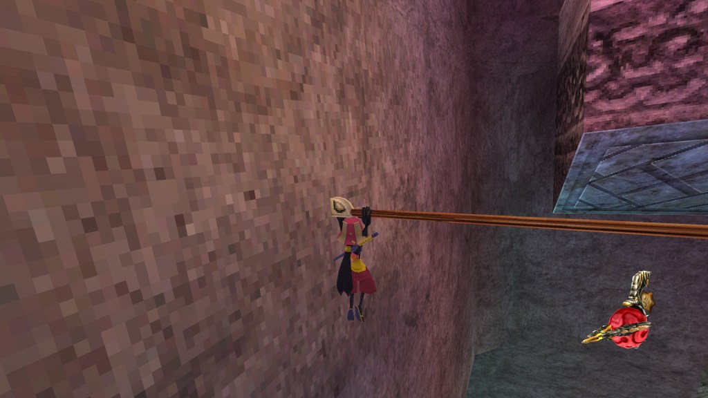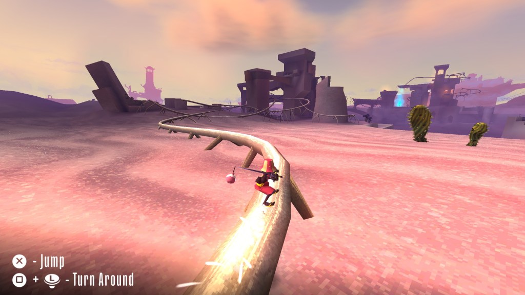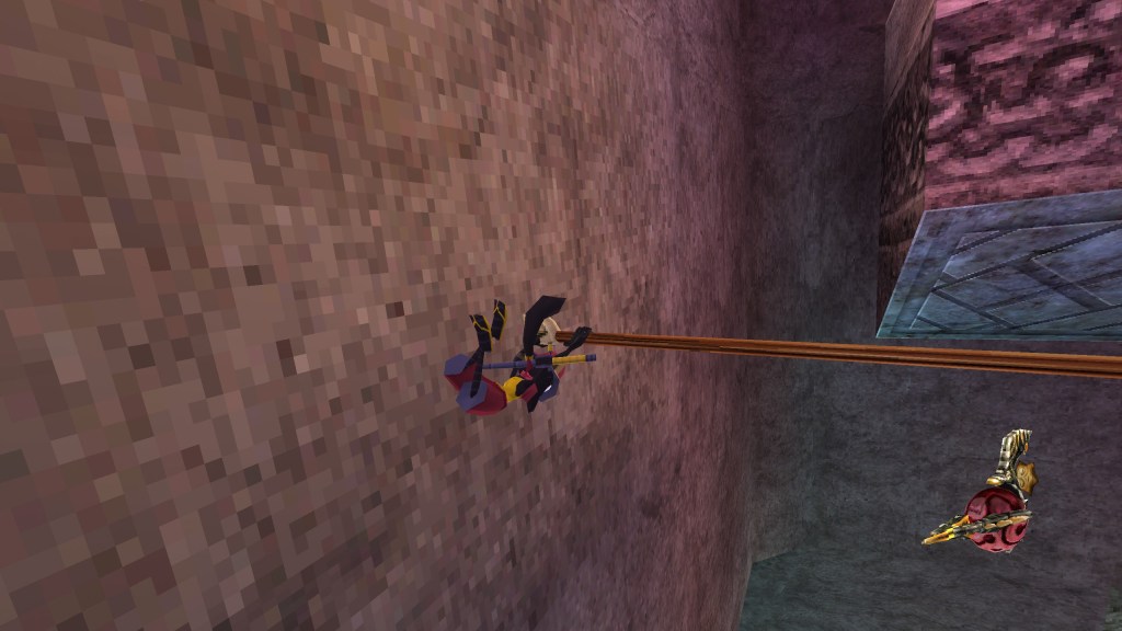 Caster can also perform neautral jumps/hops by simply pressing the jump (X) button. The harder you press down on the button, however, the higher the jump. This also applies to the tightropes and nets that you can jump on in the demo, too. One thing I really appreciate about the character animations is that when Caster lands from a jump, there’s a sort of stretchiness/buyoancy applied to the animation where his knees jut out and extend before standing back up. Jak and Daxter on the PS2 had a sort elastacity to the character animations, which I always loved. While Jak didn’t have a particularly complicated move-set, they sort of made up for it with their smooth animations. It felt really nice to do rolling long jumps in that game, for example. I also look back on Banjo-Kazooie rather fondly. While it’s yet another game with a relatively simple control scheme, it just feels good to perform the Talon Trot ability to get around quickly or running into a crouching Flapflip jump to reach a high platform. You can crouch in this game and perform a slide by pressing the square ([]) button. If you jump before the end of the slide, you’ll perform a long kick-jump, which feels really good. There’s even that summersault jump from SM64! If you’re running in one direction and then snap the left analog stack back in the opposite direction and jump, you’ll perform a really cool sideways summersault jump.