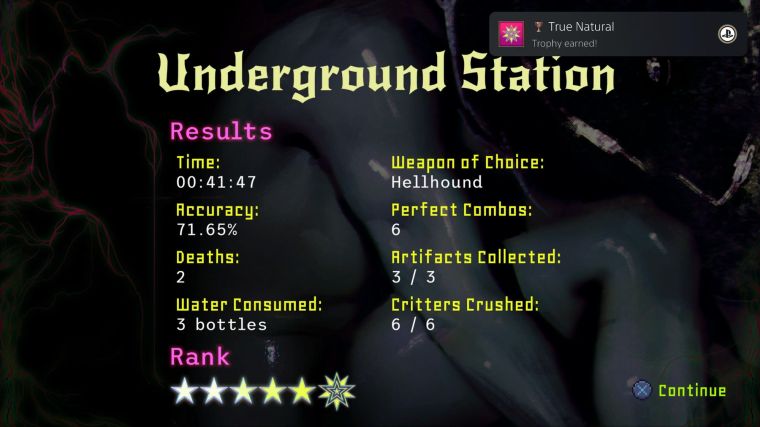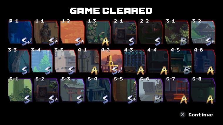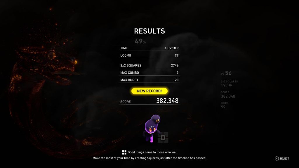 Cronos: The New Dawn’s “Results” screen has got some red on red action and it’s honestly a little hard to read. I do like how large the icon is for the rank you earned and it does show you which peoples’ consciousness (Phylactery) you “saved”. NINJA GAIDEN: Ragebound has a “GAME CLEARED” screen which shows thumbnails of each stage along with your highest rank earned. It’s very close to Bayoneta’s “Play History” menu, which I appreciate. Ragebound goes to “S++” rank, but it’s infuriatingly strict to achieve. I much prefer Art of Vengeance’s requirements as there is more wiggle-room to earn the highest rank (I wrote about both games’ ranking systems in-depth here and here). Lumines Arise’s “Results” screen isn’t much to write home about, unfortunately. It’s a fairly standard-looking menu, almost the size of a cell phone screen, and uses, yet again, a simple, white font. I do like how your customizable avatar hangs out at the bottom of the screen, though.