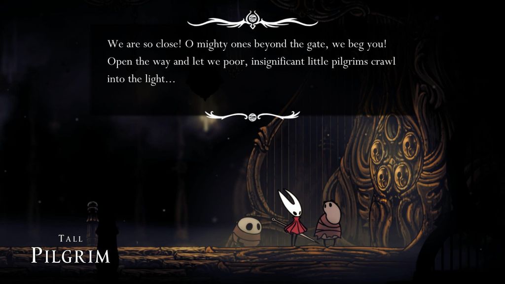 In Ghost of Yōtei, when you defeat one of the Yōtei Six, Atsu will wipe their names off of her cloth with their blood. It’s a) incredibly badass and b) a perfect example of EVP. The best part about this EVP is that it’s shown on the title-screen to remind you of your progress (even though the game immediately boots you past the title screen when you launch it). In Hollow Knight: Silksong, one of your first objectives is to locate and ring five large bells scattered across the lower lands of Pharloom. When you ring one of the larger bells, a tiny bell is slotted inside of a circular hole on the Grand Gate, which is the entrance to the Citadel, AKA, the best part of the game. Outside of this gate you’ll typically find other bugs, including the loveable but naïve, Sherma, standing and praying in front of it, wishing the door would open so that they could continue their holy pilgrimage.