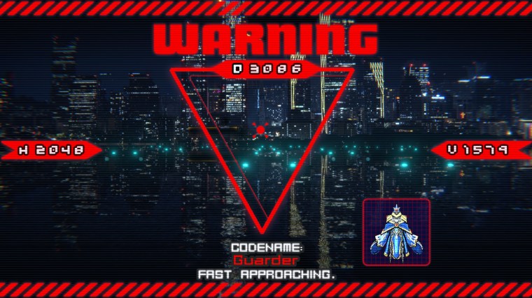 When I saw that Ancient Corp’s Earthion was finally releasing, I was salivating at the thought of what the “WARNING” screen was going to look like (okay, maybe I’m exaggerating a bit). Earthion’s “WARNING” label was somewhat disappointing to me, though. It’s simply two vertical strips, one on each side of the screen, with the “WARNING” label itself in bold, dark red font. Dunkadillo was the last game I expected to see a “WARNING” label in. It’s very rare for a 2D action-platformer to utilize a presentation style that’s typically reserved for arcade shooters/shoot ’em ups. In Dunkadillo, the “WARNING” label reads, “BAD BOY APPROACHING” in a bright red font with a thin, yellow and black caution tape strip below it. 閃攻機人アスラ – ASURA THE STRIKER – is a cool game, clearly inspired by Space Harrier, but I don’t really like the “WARNING” label used here. An upside-down red triangle is centered over the boss along with red tags surrounding it, which are coordinates, I think? There’s red caution tape along the top and bottom part of the screen as well. Bottom-centered aligned is the boss description, which reads “CODENAME: Guarder FAST APPROACHING”, at least in the example I shared above. It’s fine, but not quite what I’m looking for.