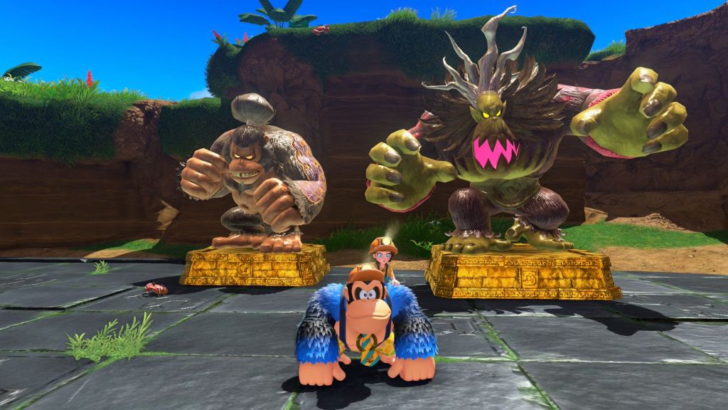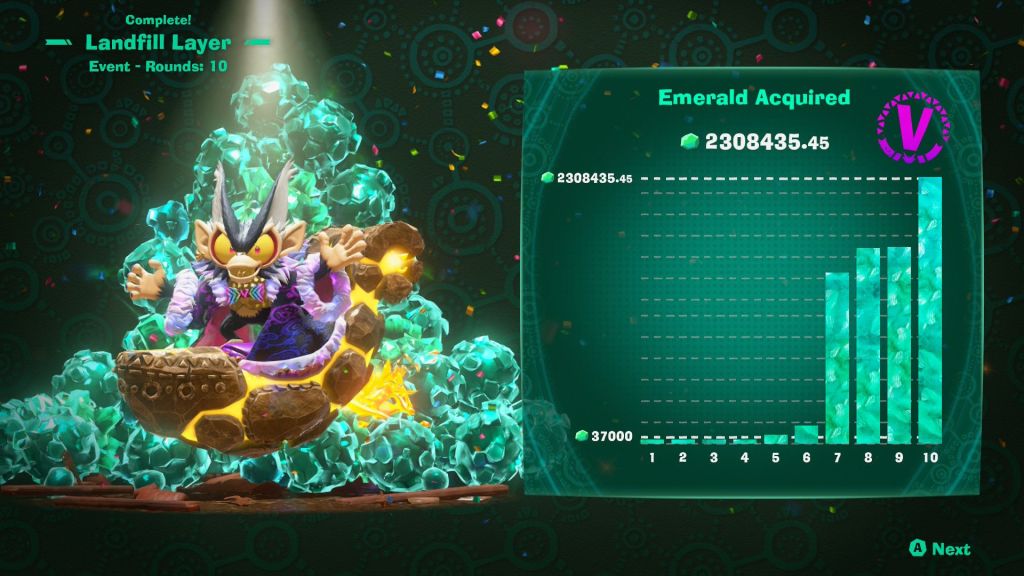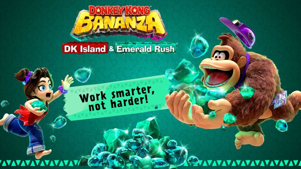 Donkey Kong Bananza: DK Island & Emerald Rush, however, I’m a bit more conflicted on. I typically don’t like run-based games or rogue-likes and that’s what this DLC is. VoidCo got the boot at the end of Bananza, so he’s made his way to DK’s home to start a new business. For many players, including myself, DK Island was a huge disappointment. The island acts as a hub of sorts to the Emerald Rush mode. It’s a bit of a letdown because DK Island is beautifully-crafted and closely resembles the home of our favorite Kongs to a tee. Although you can unlock fast-travel barrels around the island, there are no Banandium Gems to collect. Instead, you’ll unlock figures/statues that can be placed around the island with the currency you earn from participating in Emerald Rush. The statures are extremely detailed and while you can knock them around and pose in front of them for pictures, that’s all there is to do.