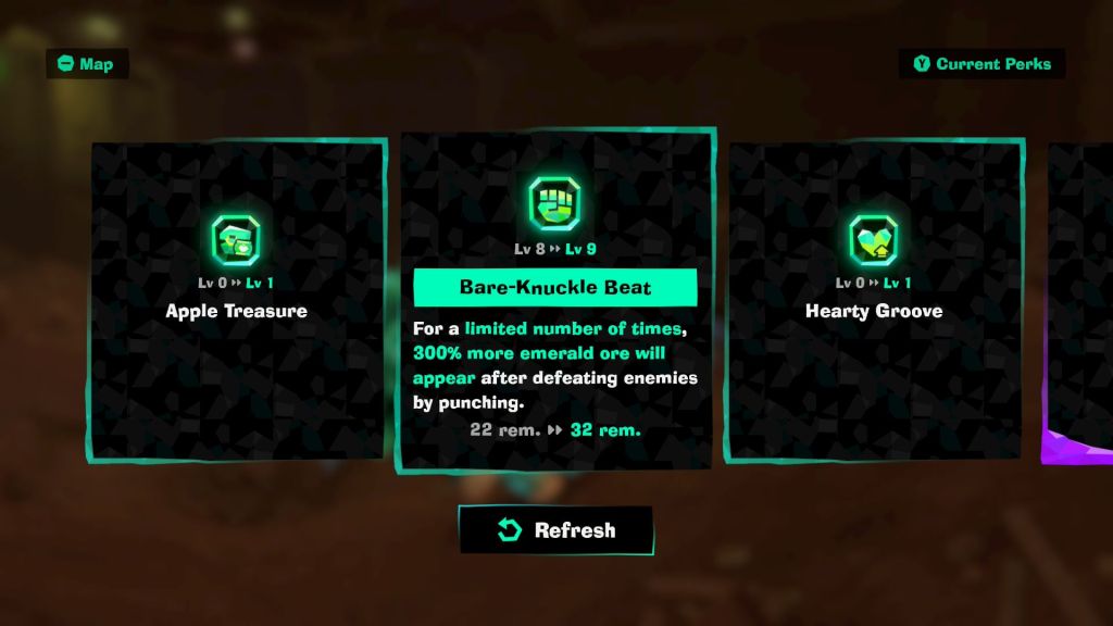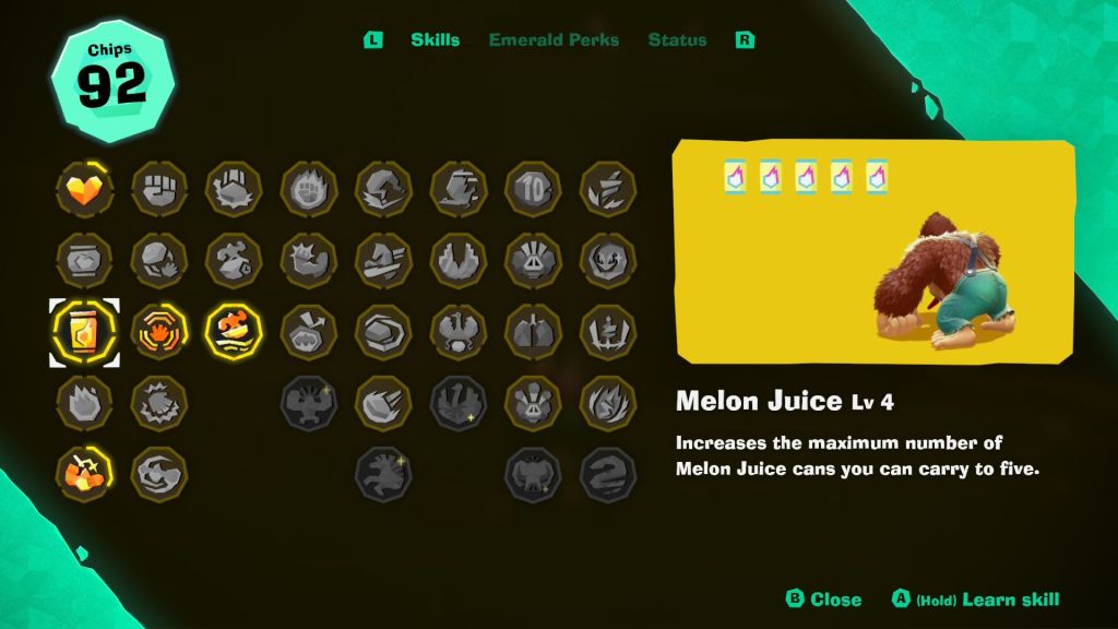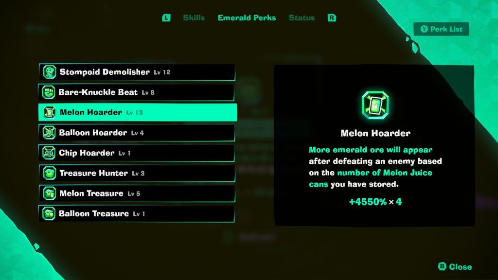 Emerald Rush is a run-based, rogue-like mode where you play an existing level from the base game under certain restrictions. When you select a stage, you’ll start the level with no skills/perks. By completing challenges issued by VoidCo, you’ll get the opportunity to choose from three randomized perks. This mode is all about the synergy between your perks and the skills that you unlock. The chips you collect in the environment can be used to unlock any skill from the skill tree. Your goal is to obtain the highest multiplier while earning emerald from challenges or other means along the way. Let’s say you choose to focus on the “Melon Hoarder” perk, which gives you more emerald based on how many Melon Juice cans you’re carrying. Well, if you max out your Melon Juice carrying capacity skill and then combine that with say the “Bare-Knuckle Beat” perk (which increase emerald drops by 300% for a limited amount of enemies defeated), forget about it! It’s actually a lot to wrap your head around at first, but if you read the perk descriptions carefully and stack certain modifiers, you’ll be raking in the emerald FAST, which ultimately will net you the coveted “V” Rank for the stage.