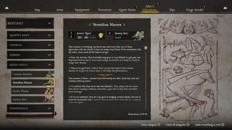 First, let’s discuss some honorable mentions. The Codex from DOOM: The Dark Ages contains some of the better writing/descriptions in the game along with some really nice illustrations of the characters and demons from the game. As much as I loved Hollow Knight: Silksong, the Hunter’s Journal isn’t too different from the first game. Hornet’s descriptions and flavor text are certainly welcomed, but the actual menu design itself is very basic and a little barebones visually. My last honorable mention that nearly won this category would be Adso’s Chronicles from Blades of Fire, particularly the Bestiary page. Not only is it contextualized within the game (your little buddy, Adso, will literally pull out a journal and begin to draw mid-battle), the art itself and the accompanying descriptions are wonderful. As you kill more enemies of the same type, the illustration will become more detailed, showing Adso’s artistic progress as both characters learn more about their foes. It’s awesome. The Vermillion Nurses are also some of my favorite enemies from any game in 2025.